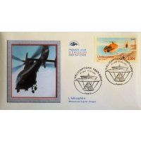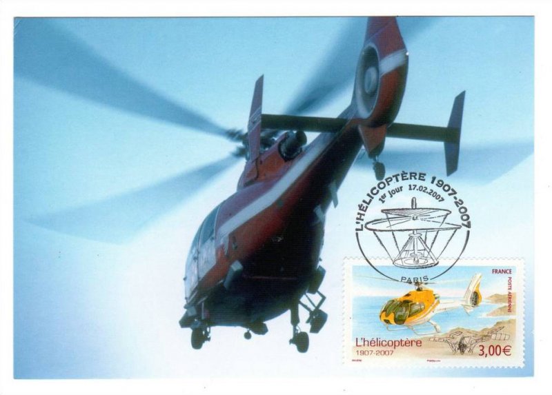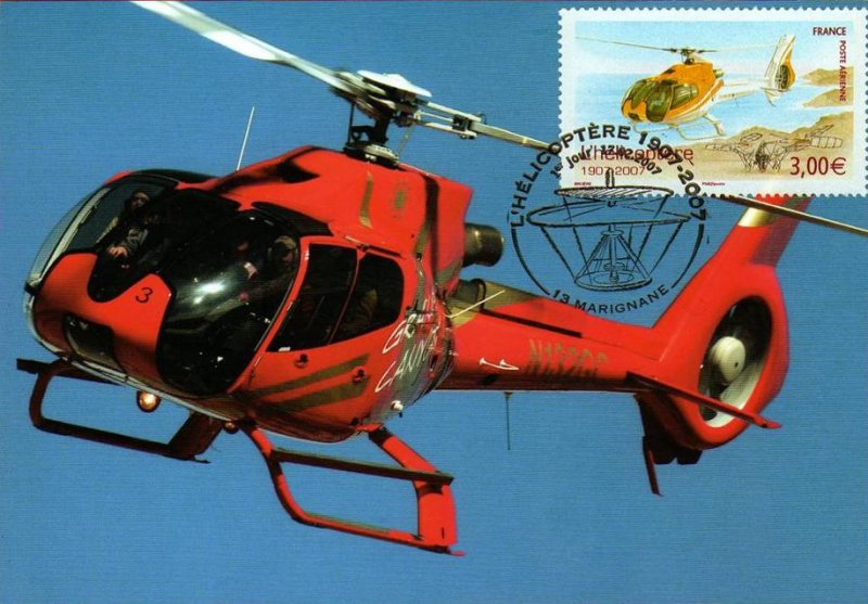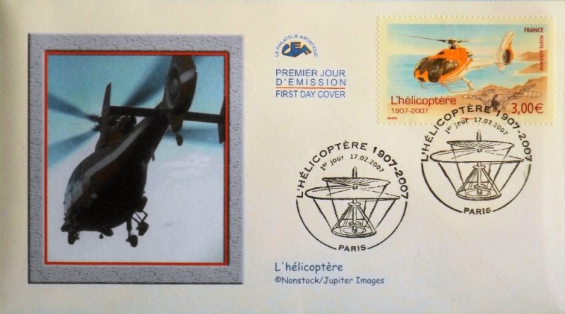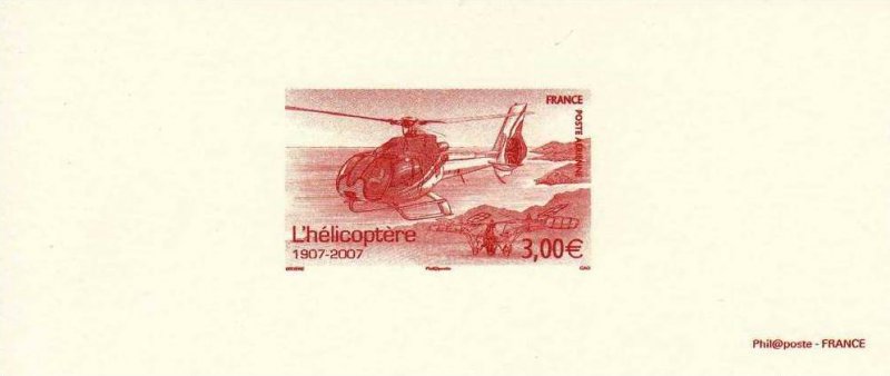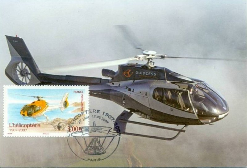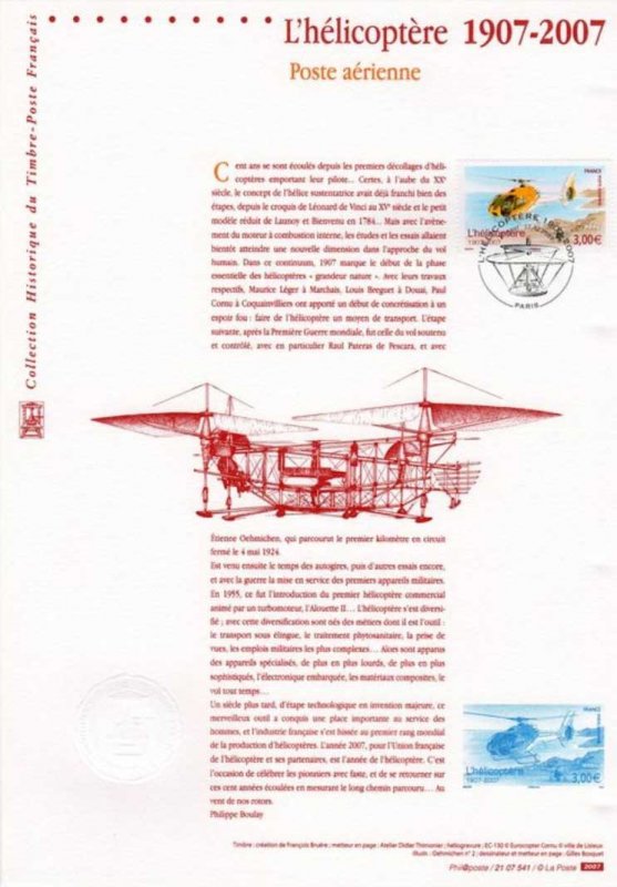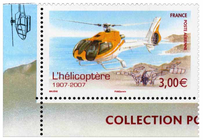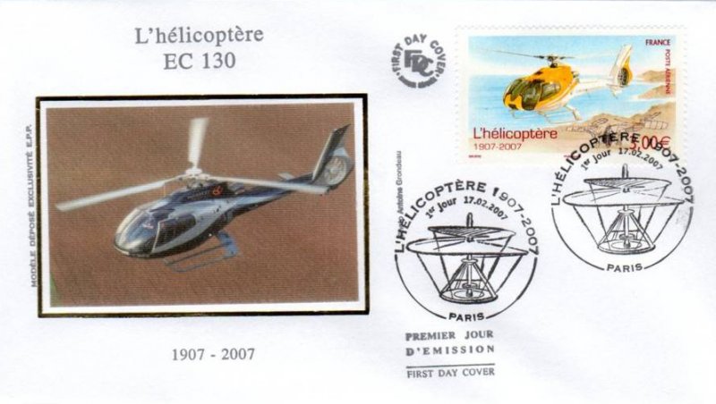 | Commentaire | L’hélicoptère 1907 - 2007 Des dessins au trait de l’EC 130 et du Cornu agrémentent le contour de la mini feuille. |