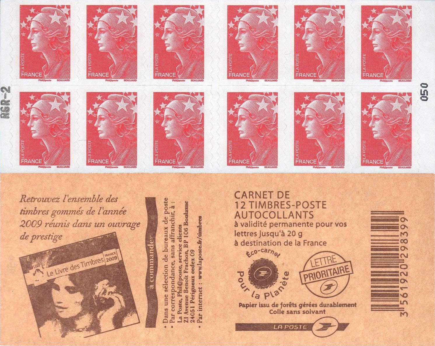 | Description | Carnet Marianne. Couverture “Le Livre des Timbres France 2009”12 TP autocollants - Tarif lettre 20 g France |