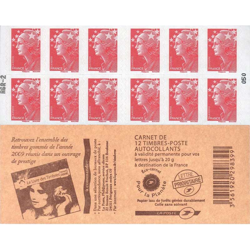 | Description | Carnet Marianne. Couverture “Le Livre des Timbres France 2009”12 TP autocollants - Tarif lettre 20 g France |