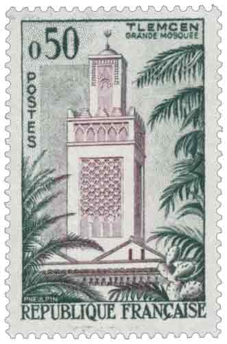 | Commentaire | Émis en France en 1960, le timbre gommé « Grande Mosquée de Tlemcen » appartient à la série touristique d’usage courant consacrée aux monuments historiques et paysages de France, d’Algérie et des territoires d’outre-mer, conçue pour accompagner l’affranchissement courant tout en valorisant un patrimoine architectural majeur, et il correspond au tarif de la lettre jusqu’à 20 grammes pour l’étranger en vigueur à cette période. Mis en vente générale le 18 janvier 1960, après une vente anticipée organisée localement à Tlemcen, ce timbre vertical représente la Grande Mosquée de Tlemcen, édifice emblématique de l’architecture religieuse almoravide, fondé au XIIᵉ siècle et reconnaissable à l’élégance de ses proportions et à la richesse maîtrisée de son décor. Le dessin et la gravure, réalisés par Jean Pheulpin, sont imprimés en taille-douce rotative, procédé particulièrement adapté à la restitution fine des volumes et des détails architecturaux tout en permettant des tirages importants pour une diffusion postale étendue. Les teintes vert foncé et lie-de-vin confèrent à la figurine une tonalité solennelle et renforcent la lecture monumentale du sujet, tandis que son retrait en mai 1962 inscrit cette émission dans la dernière phase des séries touristiques intégrant des sites algériens, lui donnant une place spécifique dans l’histoire philatélique française du début des années 1960. |