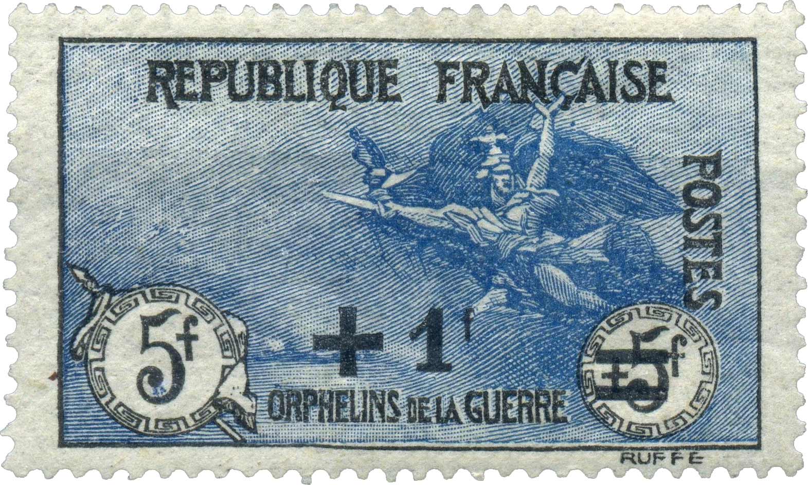| Commentaire | La Marseillaise de Rude - Orphelins de la Guerre. Le Départ des Volontaires de 1792 (aussi connu comme La Marseillaise), sculpture par François Rude, sur l' Arc de Triomphe de l'Etoile à Paris. En savoir plus sur Wikipédia : François Rude Le timbre 1 f sur 5 f + 5 f « La Marseillaise à Paris », mis en vente le 1er septembre 1922, appartient à la seconde série des timbres des Orphelins de la guerre surchargés, issue des planches originales de 1917. Dessiné par Louis Dumoulin et gravé par Léon Henri Ruffé, il met en scène l’allégorie puissante de La Marseillaise, symbole de la défense nationale et de la mobilisation patriotique de la France pendant la Grande Guerre. Imprimé en typographie, dentelé 13½ × 14, au format large de 40 × 24 mm, ce timbre bicolore noir et bleu reprend l’un des visuels les plus emblématiques de la série caritative. La surcharge rouge « 1 f » adapte le tarif postal tout en maintenant la surtaxe dédiée au soutien des orphelins de guerre et des Pupilles de la Nation, un dispositif essentiel de l’après-guerre. Retiré de la vente le 31 août 1934, ce timbre occupe une place recherchée dans les collections spécialisées en raison de sa valeur faciale élevée, de sa surcharge distinctive et de son importance historique dans la philatélie française caritative. |