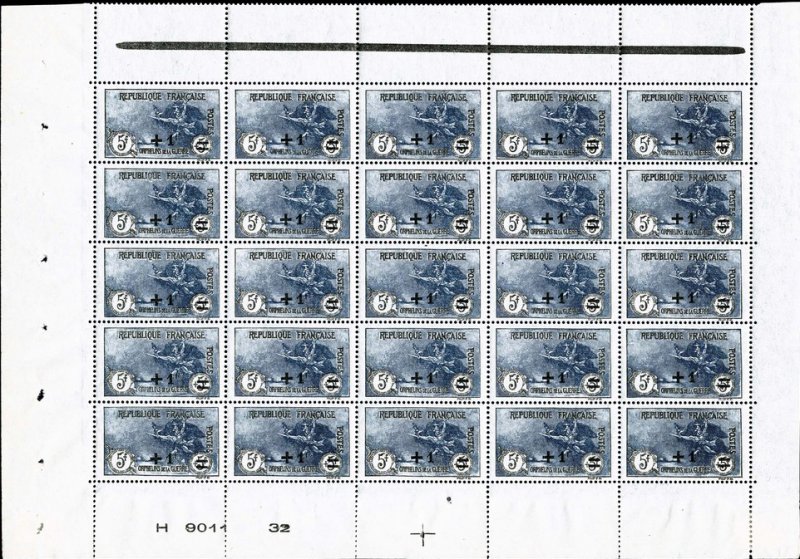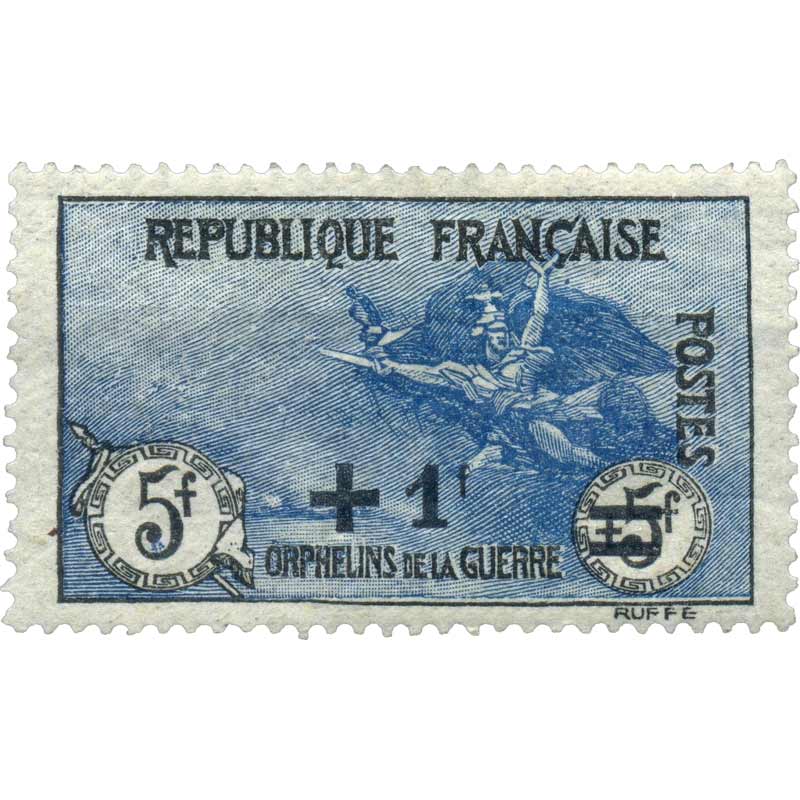 | Commentaire | La Marseillaise de Rude - Orphelins de la Guerre. Le Départ des Volontaires de 1792 (aussi connu comme La Marseillaise), sculpture par François Rude, sur l' Arc de Triomphe de l'Etoile à Paris. En savoir plus sur Wikipédia : François Rude Le timbre 1 f sur 5 f + 5 f « La Marseillaise à Paris », mis en vente le 1er septembre 1922, appartient à la seconde série des timbres des Orphelins de la guerre surchargés, issue des planches originales de 1917. Dessiné par Louis Dumoulin et gravé par Léon Henri Ruffé, il met en scène l’allégorie puissante de La Marseillaise, symbole de la défense nationale et de la mobilisation patriotique de la France pendant la Grande Guerre. Imprimé en typographie, dentelé 13½ × 14, au format large de 40 × 24 mm, ce timbre bicolore noir et bleu reprend l’un des visuels les plus emblématiques de la série caritative. La surcharge rouge « 1 f » adapte le tarif postal tout en maintenant la surtaxe dédiée au soutien des orphelins de guerre et des Pupilles de la Nation, un dispositif essentiel de l’après-guerre. Retiré de la vente le 31 août 1934, ce timbre occupe une place recherchée dans les collections spécialisées en raison de sa valeur faciale élevée, de sa surcharge distinctive et de son importance historique dans la philatélie française caritative. |