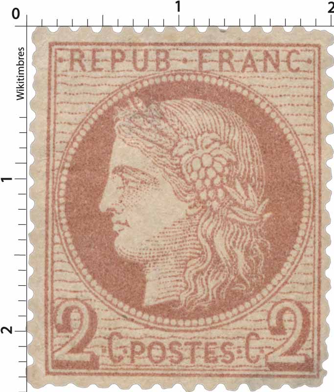 Mis en vente en mai 1872, le 2 centimes rouge-brun, n°51, s’inscrit dans les premières émissions dentelées au type Cérès sous la IIIe République. Cette valeur, conçue pour les affranchissements complémentaires et les usages internes, figure parmi les plus diffusées de la période : pas moins de 365 millions d’exemplaires sortiront des ateliers entre 1872 et juin 1876.