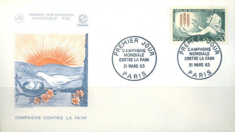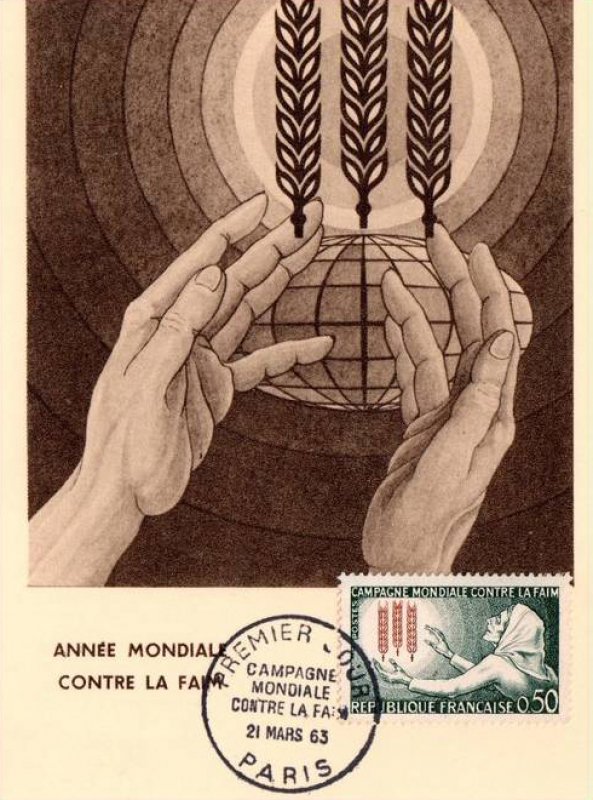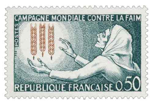 | Commentaire | Voir la vidéo "Histoires de timbres" Après avoir connu pendant des siècles famines et disettes mémorables, l'Europe occidentale avait cru ce problème de l'alimentation définitivement résolu, sinon au niveau de tous les individus du moins à celui des groupes sociaux ... Au XX· siècle, c'est à l'échelle du monde que se pose désormais cette angoissante question. Les transformations entraînées par la deuxième guerre mondiale, l'essor des techniques efficaces d'observation et d'information ont permis une prise de conscience plus nette de la disparité qui, sur ce point, oppose les pays hautement développés aux pays sous-développés. De nombreux ouvrages d'historiens, d'économistes, de démographes ont attir.é l'attention des spécialistes et de l'opinion mieux informée sur un double mouvement simultané: d'une part une progression démographique accélérée, plus nette encore dans les pays sous-développés que dans les pays « riches », d'autre part les difficultés d'augmenter d ' une façon rapide et substantielle la production agricole globale du monde. Ainsi peut s'aggraver, dans les prochaines années, l'écart déjà existant entre les ressources alimentaires et les besoins des groupes sociaux les plus défavorisés. La double menace de la fa im et de la misère risque d'atte indre des centaines de millions d'hommes. Une campagne a été décidée à l'échelle internationale par l'Organisation des Nations Unies pour l'Alimentation et l'Agriculture (F.A.O.). Son but est «non pas de soulager temporairement la faim et la malnutrition mais bien de les éliminer progressivement et à jamais de la face de la terre ». Il s'agit donc de permettre aux peuples les plus démunis de s'aider eux-mêmes et d'améliorer d'une façon durable l'utilisation de leurs ressources matérielles et humaines. Plus de deux mille missions d'assistance technique auxquelles la F.A.O. a déjà participé montrent dans quel sens s'oriente l'action éducatrice de l'organisation internationale: amélioration constante de l'élevage sous toutes ses formes et des produits dérivés, augmentation du rendement des céréales, perfectionnement des méthodes de conservation des produits alimentaires, tels sont les résultats non négligeables déjà obtenus. Pour toucher l'opinion mondiale, il a paru qu'un des moyens les plus efficaces était de prévoir l'émission, par l'ensemble des pays du monde, de timbres symbolisant cette lutte contre la faim . Chaque administration ' des Postes (et, à la fin de 1962, on estimait que le nombre des administrations postales qui participeront au plan philatélique s'établirait à près de cent quarante) est libre du choix de la vignette ... Un symbole spécial constitué d'épis de blé mûrissants, image de l'accroissement de production alimentaire que la campagne s'efforce de provoquer, marquera le trait commun de cette émission internationale. Ainsi s'affirme, avec une ampleur qui avait été rarement atteinte, le mouvement général de compréhension et de solidarité qui unit de plus en plus les différentes civilisations du monde contemporain. |