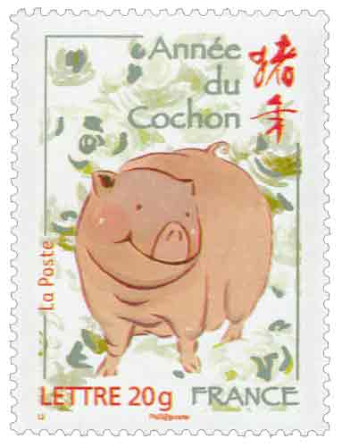 | Commentaire | De l’année du rat à l’année du cochon, le système astrologique oriental comprend douze signes animaux. Le cycle du zodiaque chinois se renouvelle ainsi tous les douze ans, le signe du cochon étant le dernier. Timbre sans millésime |