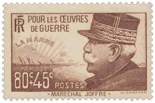 | Commentaire | Joseph Joffre, Maréchal de France (1852-1931) - La Marne - Pour les Œuvres de guerre. Le timbre semi-postal à 80 centimes + 45 centimes brun-rouge, dessiné et gravé par Henry Cheffer, portraiture le maréchal Joseph Joffre, commandant en chef lors de la victoire de la bataille de la Marne en septembre 1914 qui stoppa l'avancée allemande et stabilisa le front occidental durant la Grande Guerre. Imprimé en taille-douce rotative par feuilles de 25, dentelé 13, il ouvre une série de quatre valeurs émise le 1er mai 1940 au profit des œuvres de guerre durant la drôle de guerre, sert aux cartes postales intérieures ordinaires et est retiré le 28 novembre 1940, tiré à 1,7 million d'exemplaires. |