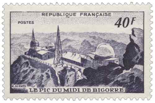 | Commentaire | Visuel : dans les Hautes-Pyrénées, le Pic du Midi de Bigorre (2 876 m) et son téléphérique (inauguré en 2001 et rénové en 2000), avec la plateforme de l'observatoire astronomique (inauguré en 1882), et le relais de télévision (1957, puis 1963). La première Réserve Internationale de Ciel Étoilé française à été labellisée en 2013, avec pour objectif de limiter le phénomène exponentiel qu'est la pollution lumineuse. Le site comprend 4 télescopes, 1 coronographe et 1 lunette solaire Jean Rösch. Mis en vente en France à partir du 22 décembre 1951 à Bagnères-de-Bigorre, puis du 24 décembre dans l’ensemble des bureaux du territoire, le timbre-poste touristique de la série courante représentant l’Observatoire du Pic du Midi de Bigorre illustre la volonté de l’administration postale de valoriser les grands sites scientifiques et naturels français à travers des valeurs d’usage courant. Dessiné et gravé en taille-douce par Raoul Serres, ce timbre horizontal de 40 francs met en scène l’observatoire implanté à haute altitude sur l’un des sommets les plus accessibles des Pyrénées centrales, lieu emblématique tant pour le tourisme que pour la recherche scientifique. Créé à la fin du XIXᵉ siècle et devenu propriété de l’État en 1882, l’observatoire du Pic du Midi s’est imposé comme un centre majeur d’observations astronomiques, météorologiques et géophysiques, unique en France par son implantation en haute montagne. L’émission de 1951 s’inscrit dans un contexte de modernisation des infrastructures scientifiques et de diffusion de leur image auprès du grand public, tout en répondant à des besoins postaux spécifiques liés aux tarifs élevés, notamment pour les envois vers les territoires éloignés, intégrant ainsi pleinement ce timbre dans la circulation postale quotidienne.