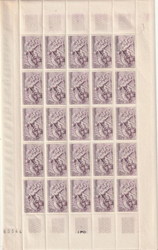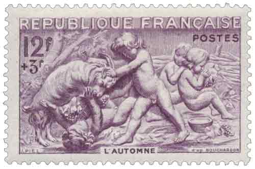 | Commentaire | Émis en 1949, le timbre-poste gommé intitulé L’Automne s’inscrit dans la série française Les quatre saisons par Edme Bouchardon, programme philatélique de fin d’année destiné à valoriser, par un usage postal effectif, un ensemble sculpté majeur du XVIIIᵉ siècle conservé à Paris. Dessiné et gravé par Jules Piel, ce timbre horizontal reproduit le bas-relief allégorique de l’Automne placé au pied de l’une des statues monumentales de la fontaine des Quatre-Saisons, édifiée rue de Grenelle dans le 7ᵉ arrondissement, œuvre emblématique de la sculpture décorative des Lumières. Imprimé en taille-douce rotative, procédé privilégié pour les émissions artistiques de qualité de l’après-guerre, il restitue avec précision le modelé du relief, la composition des figures et le traitement des volumes caractéristiques du style de Bouchardon. Sa place dans la série est celle d’une valeur intermédiaire assortie d’une surtaxe au profit de la Croix-Rouge française, tandis que ses usages postaux couvrent plusieurs affranchissements courants de la fin des années 1940, assurant une diffusion réelle sur le courrier de 1949. Cette émission illustre la volonté de l’administration postale française d’associer fonction utilitaire, soutien humanitaire et mise en valeur du patrimoine artistique national issu du XVIIIᵉ siècle.