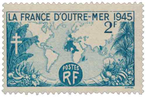 | Description | La France d’outre-mer avec millésime 1945 et Croix de Lorraine |