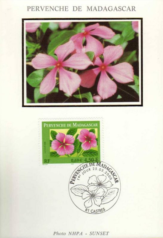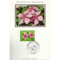 | Commentaire | Description synthétique du visuel du timbre : La pervenche de Madagascar (Catharanthus roseus G. Don) est une petite plante herbacée de la famille des apocynacées, poussant dans la plupart des pays tropicaux. Elle a mobilisé l’espoir et le talent de la communauté scientifique et médicale pour aboutir aujourd’hui à l’élaboration de médicaments de la thérapeutique anticancéreuse. |