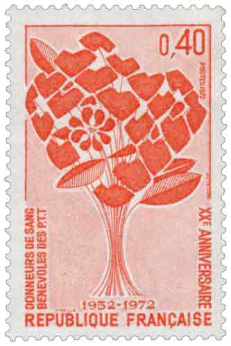 | Commentaire | Émis en 1972 en France à l’occasion du XXᵉ anniversaire de l’Union nationale des Donneurs de sang bénévoles des PTT, ce timbre commémoratif s’inscrit dans la tradition des émissions philatéliques consacrées aux grandes causes sociales et humanitaires portées par des organisations professionnelles. D’une valeur faciale de 0,40 franc, il correspond au tarif intérieur en vigueur pour l’affranchissement des lettres simples et a donc connu un usage postal courant, ce qui explique une diffusion massive et une présence fréquente sur le courrier de l’époque. Cette émission rend hommage à l’engagement des agents des Postes et Télécommunications qui, dès 1952, ont structuré un réseau de don de sang bénévole au sein de leur milieu professionnel, contribuant activement au développement de la transfusion sanguine en France à une période où la médecine moderne, la chirurgie lourde et la réanimation dépendaient de plus en plus de cette ressource vitale. Le timbre prend place dans la série des émissions commémoratives françaises du début des années 1970 valorisant la solidarité nationale, aux côtés d’autres sujets liés à la santé, aux associations ou aux actions humanitaires. Sur le plan artistique et symbolique, la figurine, dessinée par Pierre Belle et gravée par Georges Bétemps, adopte un langage graphique clair et immédiatement lisible : un bouquet stylisé en forme de cœur, composé de petites fleurs-cœurs, évoque à la fois la générosité, la vie et l’union, tandis que la fleur centrale rappelle l’emblème de l’association. L’impression en taille-douce rotative confère au timbre un relief fin et précis, caractéristique des productions françaises de qualité de cette période, tout en renforçant la solennité du message. Une donnée souvent citée et historiquement établie souligne l’ampleur de cet engagement : en vingt ans, les donneurs de sang bénévoles des PTT avaient déjà permis la collecte de plusieurs centaines de milliers de flacons, illustrant concrètement la contribution de ce mouvement à la santé publique nationale. Article rédigé pour WikiTimbres |