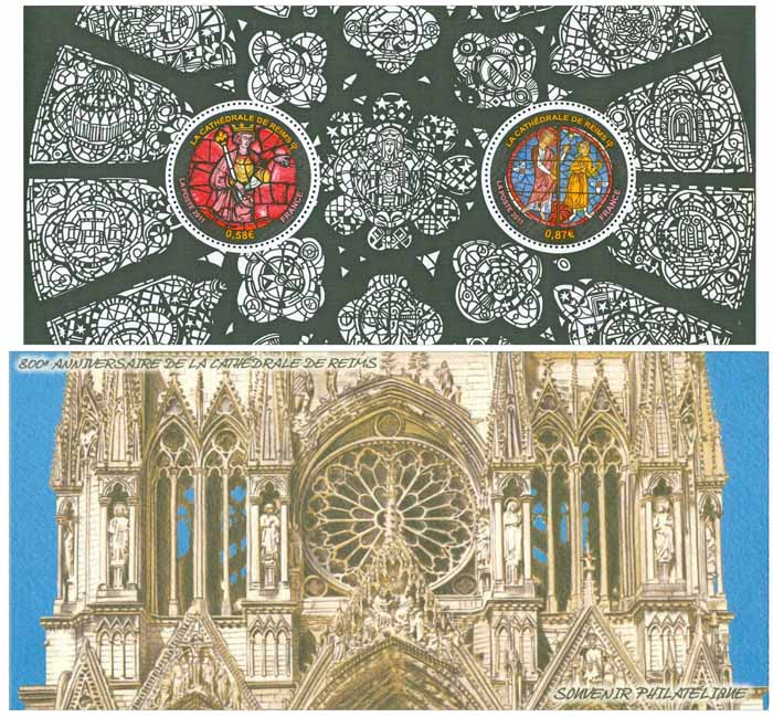 | Commentaire | La Cathédrale de Reims a été bâtie au XIIIe siècle. Réalisation majeure de l’art gothique en France, elle est inscrite au patrimoine mondial de l’UNESCO depuis 1991. Au printemps 2011, la Cathédrale fêtera son 800e anniversaire. À ce titre, La Poste émet un bloc de deux timbres-poste ronds en forme de vitraux sur un fond de rosace ornementale.