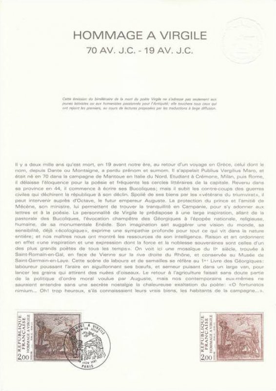 | Description | Hommage à Virgile (70 av J.C-19 av J.C), poète et écrivain latin |