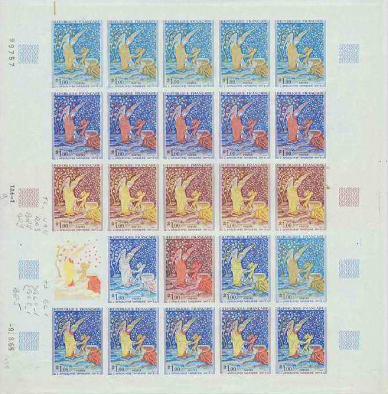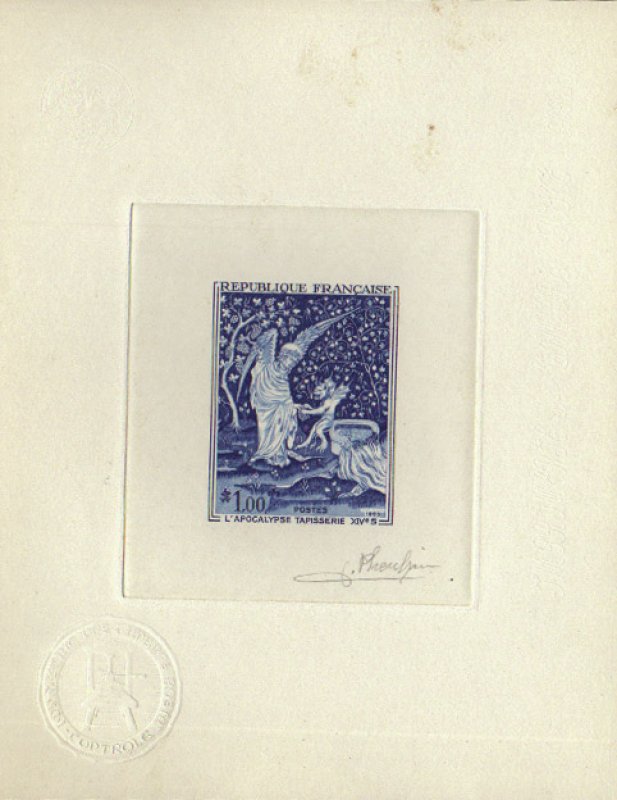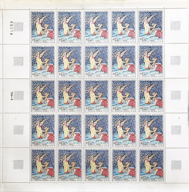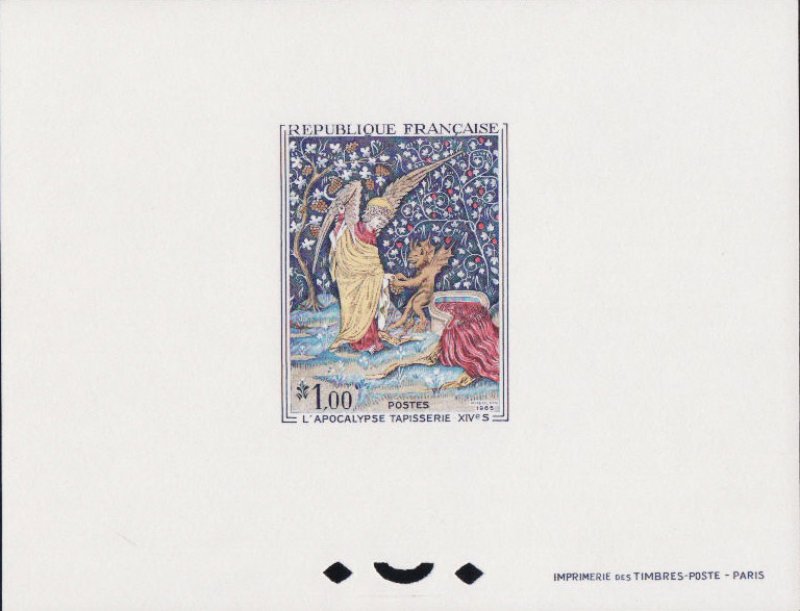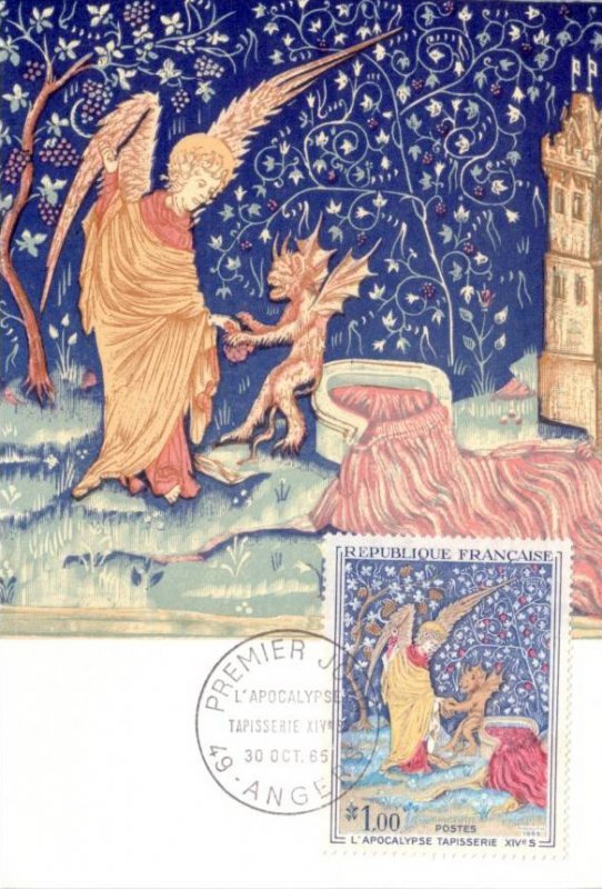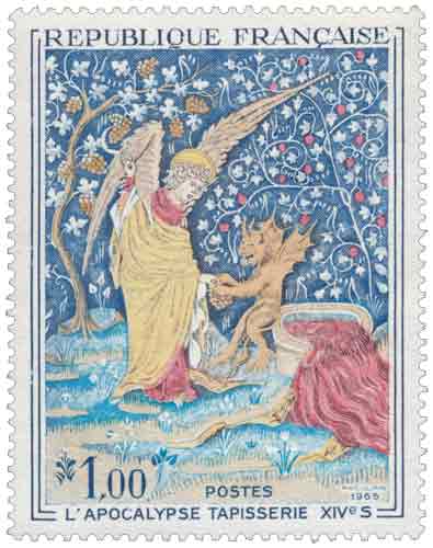 | Commentaire | Imagine un immense ruban de laine et de soie, long comme deux wagons de train, tendu comme un parchemin sacré au cœur d’un château… Tu es à Angers, devant la tapisserie de l’Apocalypse, chef-d’œuvre tissé au XIVᵉ siècle, miraculé du temps et des hommes. Commandée par Louis Ier d’Anjou en 1373, cette tapisserie est tout sauf un simple décor. C’est une vision cosmique, une bande dessinée médiévale qui donne chair au texte de Saint Jean : cavaliers de l’Apocalypse, anges vengeurs, cuves débordant de sang... on ne fait pas dans la dentelle. Le peintre Hennequin de Bruges en a dessiné les "pourtraictures" (le mot est délicieux), et c’est le génial lissier Nicolas Bataille qui, en sept ans, tisse les sept pièces monumentales. En tout, 105 tableaux, bordés de ciel et de terre — bleu en haut, vert en bas — comme un théâtre céleste où l’humanité joue sa dernière scène. Mais voilà. Après avoir été chérie, exposée, honorée... la tapisserie sombre dans l’oubli. En 1782, on essaie même de la vendre. Personne n’en veut. Pire : pendant la Révolution, on la découpe pour couvrir des orangers, garnir des écuries, doubler des rideaux. Pathétique. Et pourtant, un évêque (Angebault, souviens-toi de son nom) la sauve in extremis au XIXᵉ siècle. En 1954, enfin, elle retrouve sa dignité : une salle entière du château d’Angers lui est dédiée. Juste retour des choses. Aujourd’hui, ce "beau tapis de Monsieur d’Anjou", comme l’appelait un visiteur d’Arles en 1400, fascine encore. Pas besoin de croire à l’Apocalypse pour ressentir sa force. Il suffit d’ouvrir les yeux… et peut-être de se demander : que restera-t-il de nous, dans 700 ans ? WikiTimbres |