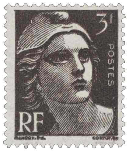 | Commentaire | Le timbre gommé de 1945 « Marianne de Gandon » à 3 francs brun foncé s’inscrit dans la série définitive mise en place après la Libération afin d’assurer une iconographie républicaine stable et durable pour les usages postaux courants. Mis en vente le 7 avril 1945, il correspond à une valeur fortement sollicitée dans le trafic intérieur, notamment pour l’affranchissement des lettres jusqu’à 50 grammes ainsi que pour divers suppléments liés aux envois recommandés, aux imprimés ordinaires et aux expéditions à destination des militaires. Cette large palette d’usages explique son tirage exceptionnellement élevé, caractéristique des valeurs clés de la série Marianne de Gandon. Le choix de la Marianne, figure allégorique de la République, traduit la volonté de réaffirmer l’autorité et la continuité de l’État dans le contexte de l’après-guerre. Le dessin de Pierre Gandon, à la fois classique et solennel, est gravé par Henri Cortot et imprimé en typographie rotative, procédé adapté à une production de masse et à une diffusion prolongée sur l’ensemble du territoire. |