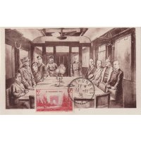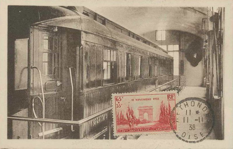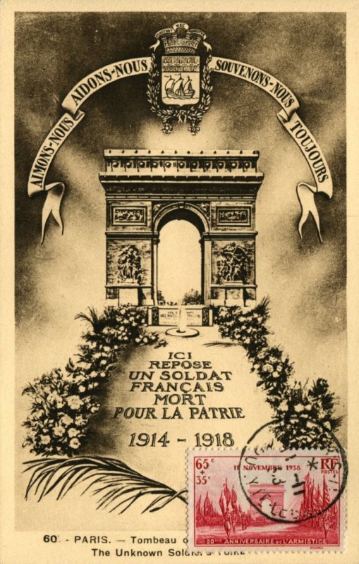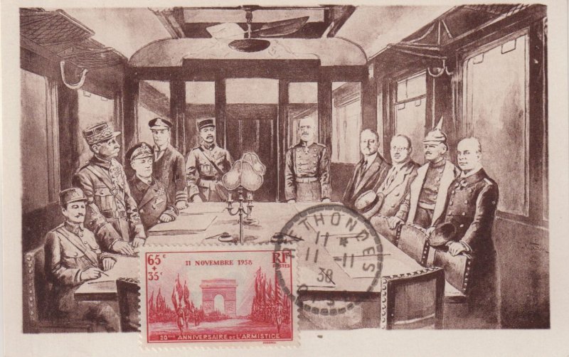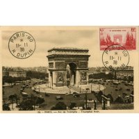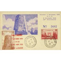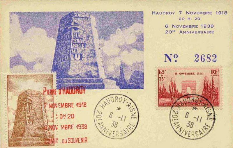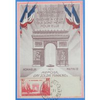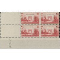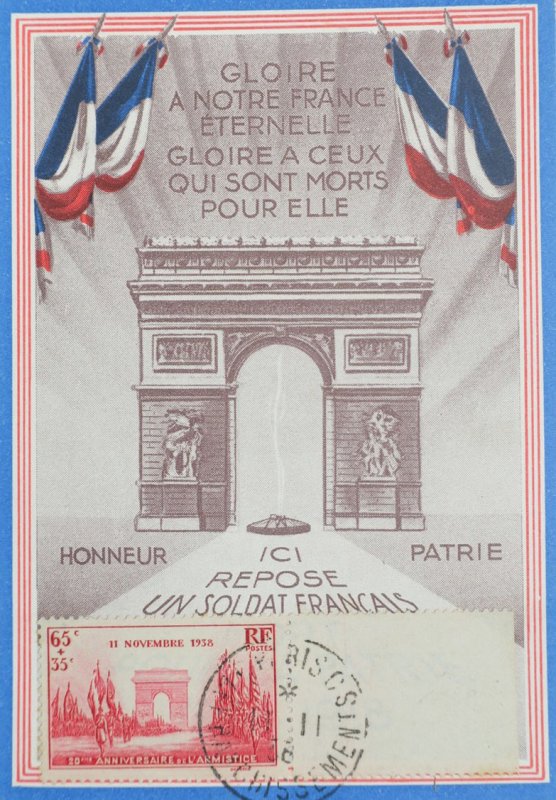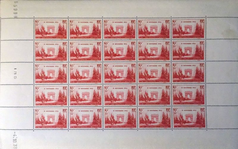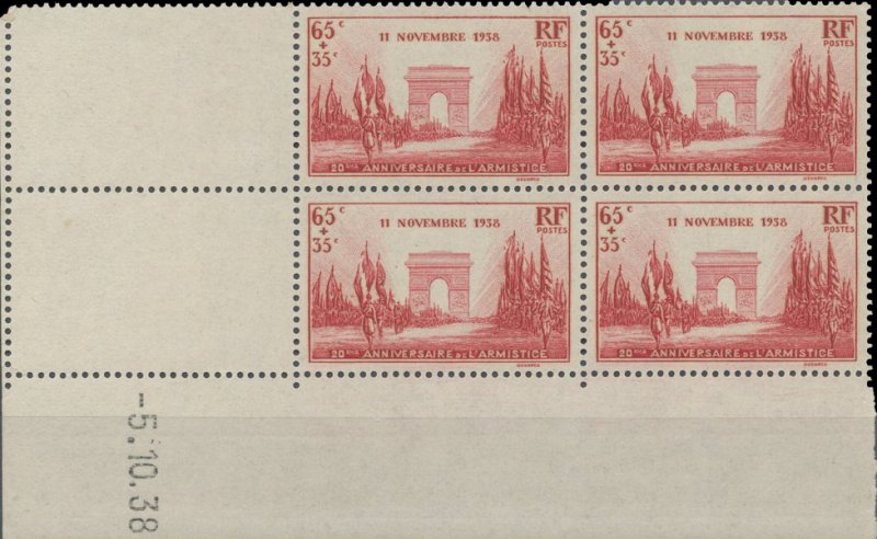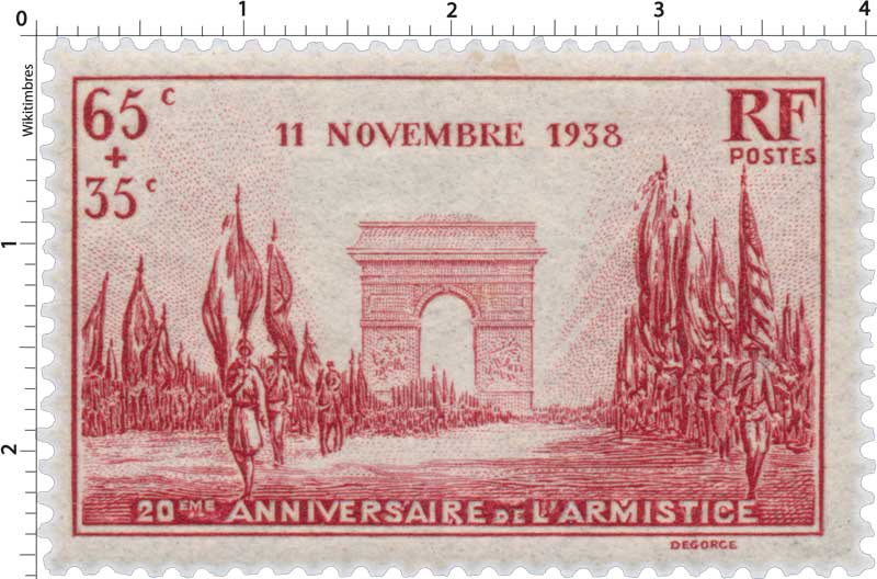 | Commentaire | 20e anniversaire de l'Armistice du 11 novembre 1938. Visuel : timbre demandé par l'une des principales associations d'anciens combattants, soutenue par le ministre des Pensions. L'administration des Postes s'associe à l'émission avec ce TP à surtaxe. Le visuel choisi dans l'esprit des fêtes de l'Armistice représente la victoire des Alliés en 1918. Ce sujet sera repris en 1939 et 1940 sur deux cartes postales, et sur une enveloppe, mais sans surtaxe. Émis le 8 octobre 1938 comme timbre semi-postal à surtaxe pour le vingtième anniversaire de l'Armistice, ce 65 centimes rouge carmin figure un clairon symbolisant la cessation des hostilités. Dessiné et gravé en taille-douce par Georges-Léo Degorce, il est imprimé en rotatif à feuilles de 25 exemplaires. Tiré à 1,7 million d'exemplaires dont 990 000 vendus, la surtaxe de 35 centimes profite à la Confédération Nationale des Anciens Combattants et Victimes de Guerre et il affranchissait la lettre jusqu'à 20 g intérieure au premier échelon. Signé le 11 novembre 1918 dans un wagon en forêt de Rethondes après le clairon du caporal Pierre Sellier le 7 novembre, l'Armistice mit fin à la Grande Guerre déclenchée en août 1914 ; il préfigura le traité de Versailles du 28 juin 1919, dont les clauses sévères alimentèrent en Allemagne un ressentiment propice à l'essor du nazisme. |