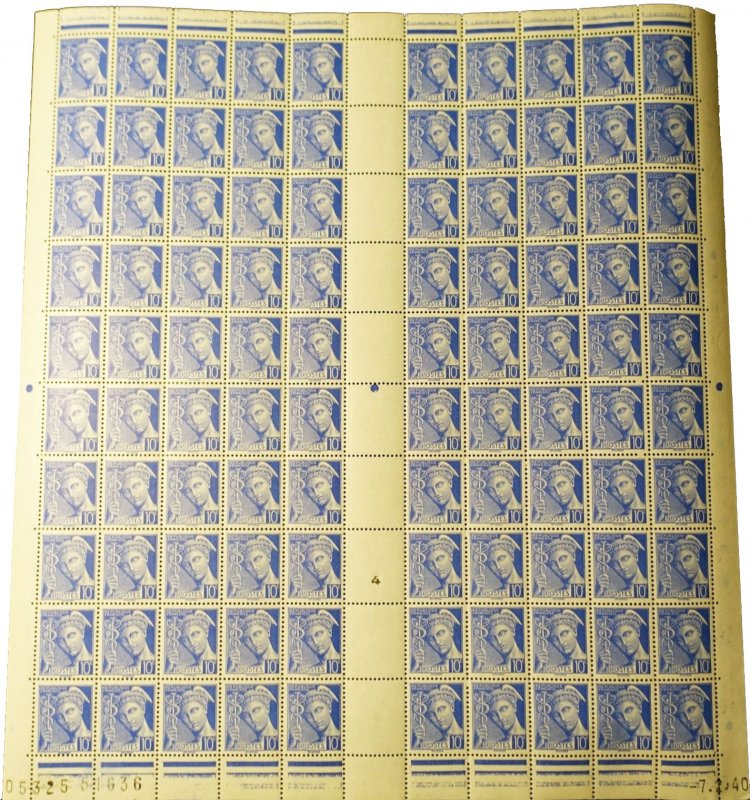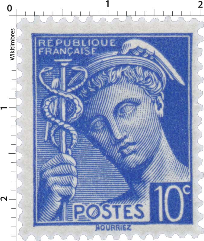 | Commentaire | Émis le 17 octobre 1938 dans la première série du type Mercure qui modernise les valeurs courantes basses en remplaçant Iris et Cérès, ce timbre de 10 centimes bleu servait au supplément de poste restante pour les journaux. Dessiné et gravé par Georges Hourriez, il est imprimé en typographie à feuilles de 100 exemplaires. Tiré à 450 000 exemplaires, il connaît une carrière interrompue : retiré une première fois, rétabli en septembre 1941 puis réémis après la suppression prématurée de la série Pétain type Prost, avant retrait définitif en octobre 1943. L'effigie de Mercure, dieu romain du commerce et messager ailé, illustre la célérité postale par son pétase orné d'ailes et sa caducée, marquant une étape transitoire dans l'iconographie républicaine des émissions courantes.