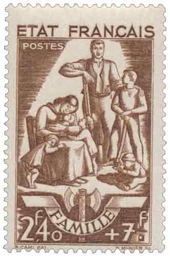 | Commentaire | Famille. Démonétisé le :01/11/1944 Ce timbre gommé français de 1943 appartient à la série « Travail Famille Patrie – 24 avril 1943 », émission emblématique du régime de Vichy destinée à illustrer les trois piliers idéologiques officiels à l’occasion du 87ᵉ anniversaire du maréchal Pétain. Intitulé « Famille », il met en avant la cellule familiale telle que conçue par la doctrine vichyste, valorisant la natalité, la hiérarchie familiale et le rôle social assigné aux parents, dans une perspective explicitement morale et politique. Dessiné par Robert Cami et gravé par Pierre Munier, le timbre adopte un grand format vertical et une composition symbolique destinée à être immédiatement lisible par le public. Sa valeur faciale de 2,40 francs, correspondant à l’affranchissement de la carte postale pour l’étranger, est assortie d’une surtaxe élevée de 7 francs au profit du Secours National, ce qui confirme la double finalité idéologique et financière de la série. Imprimé en taille-douce rotative polychrome et mis en vente sur une période volontairement courte en 1943, ce timbre fait partie des rares émissions portant explicitement la mention « État Français » et sera, comme l’ensemble de la série, démonétisé le 1er novembre 1944, devenant un document philatélique directement lié à la propagande officielle de l’Occupation. |