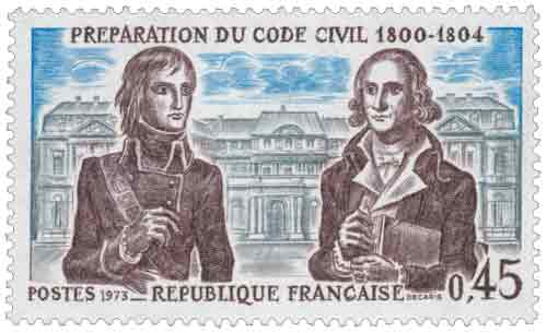 Émis en France en 1973 dans la série « Histoire de France », ce timbre commémore la préparation du Code civil entre 1800 et 1804, l’une des réalisations institutionnelles majeures du Consulat. Il évoque le travail engagé sous l’autorité de Napoléon Bonaparte, alors Premier Consul, pour doter la France d’un corps de lois unifié, stable et applicable sur l’ensemble du territoire. Héritier direct des principes de 1789, le Code civil consacre l’égalité des citoyens devant la loi, la liberté civile et la protection de la propriété, tout en opérant une synthèse pragmatique entre le droit romain, les ordonnances de l’Ancien Régime et les lois révolutionnaires. Le timbre rappelle également le rôle central joué par la commission de juristes chargée de la rédaction, dominée par Jean-Étienne-Marie Portalis, dont l’influence marque durablement l’esprit et la cohérence du texte. Par son iconographie associant les figures du pouvoir politique et juridique au décor du Conseil d’État, l’émission souligne la dimension collective et institutionnelle de cette œuvre fondatrice. En 1973, dans un contexte où les grandes réformes juridiques et sociétales sont largement débattues, La Poste choisit de rappeler la portée historique d’un code toujours en vigueur, certes profondément amendé, mais demeuré le socle du droit civil français. Le timbre s’inscrit ainsi dans une politique commémorative visant à mettre en valeur les constructions durables de l’État et leur rayonnement international, le Code civil ayant servi de modèle ou de référence dans de nombreux pays d’Europe, d’Amérique, d’Afrique et d’Asie. Une citation attribuée à Napoléon, souvent rappelée par les historiens, résume cette postérité lorsqu’il affirma que sa véritable gloire ne résidait pas dans ses victoires militaires mais dans ce Code appelé à survivre aux régimes et aux siècles. |