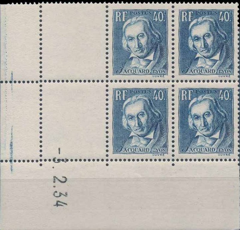 .Émis le 19 mars 1934, ce timbre rend hommage à l’un des inventeurs français les plus déterminants pour l’histoire industrielle : Joseph-Marie Jacquard, créateur du métier à tisser mécanique utilisant des cartes perforées, véritable ancêtre conceptuel de l’informatique.