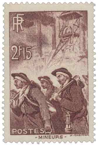 | Commentaire | Ce timbre vertical de couleur brun-lilas a été émis en 1938 et est dédié aux Mineurs. Il s'agit d'une œuvre marquante qui illustre la dureté du travail dans les mines. Description et Contexte de l'Émission Le dessin et la gravure d'Henry Cheffer sont particulièrement expressifs. Le timbre représente des mineurs exténués revenant du fond, dont la posture fatiguée est soulignée par des lignes obliques et parallèles. En arrière-plan, le puits de mine et les cheminées, dressés verticalement, contrastent et accentuent le labeur des hommes. L'attention portée aux détails de la gravure, notamment le traitement des fumées par des courbes et du pointillisme, souligne ce contraste entre la force de la machinerie et l'épuisement humain.
