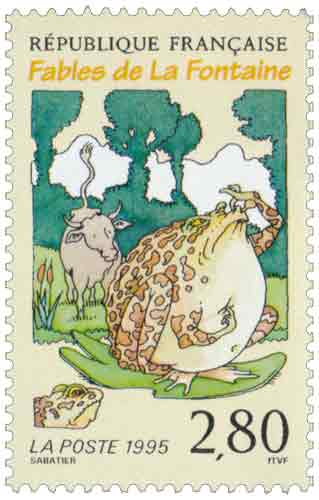 | Description | La grenouille qui voulait se faire aussi grosse que le bœuf. Tricentenaire de la mort de Jean de la Fontaine (1621-1695), poète, fabuliste et romancier, né à Château-Thierry (Aisne) |