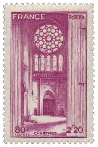 | Commentaire | Le timbre La cathédrale de Chartres, émis en novembre 1944 avec surtaxe au profit du Secours national, appartient à la série des sites et monuments choisie à la Libération pour associer patrimoine national et solidarité. Dessiné et gravé par Charles Mazelin, il représente la Cathédrale Notre-Dame de Chartres, édifice gothique majeur édifié principalement au début du XIIIᵉ siècle après l’incendie de 1194, dont l’exceptionnelle conservation des sculptures et vitraux en fait un repère monumental dominant la Beauce. Le traitement en taille-douce met en valeur la verticalité des tours et la profondeur des volumes, parfaitement adaptées au grand format adopté pour cette émission caritative, tandis que la teinte lie-de-vin renforce la solennité du sujet et sa lisibilité. |