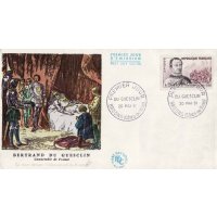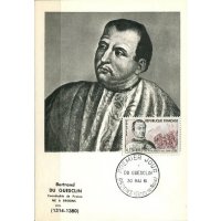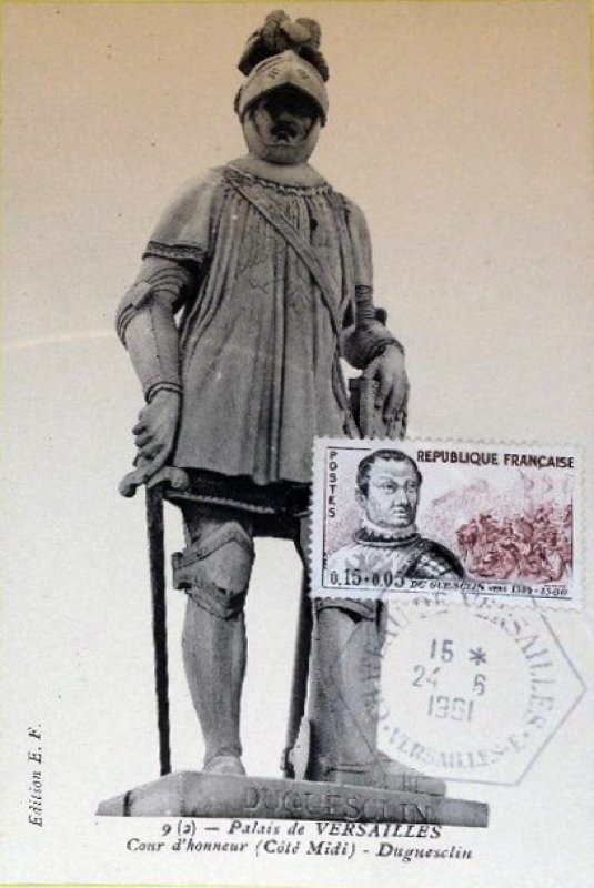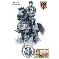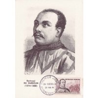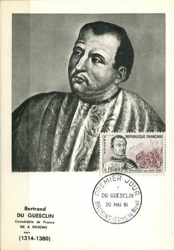 | Commentaire | Erreur naissance vers 1320 Visuel : Bertrand Du Guesclin, le 16 mai 1364, à la bataille de Cocherel (27-Eure) où le roi Charles II de Navarre, dit "Charles le Mauvais" (1332-1387) est battu. Bertrand du Guesclin : Connétable de France et de Castille, surnommé le "Dogue noir de Brocéliande" - né vers 1320 au château de la Motte-Broons (près de Dinan, Côtes-d´Armor) il décède le 13 juil.1380, lors du siège de la forteresse de Châteauneuf-de-Randon (48-Lozère). Ce noble breton armé chevalier en 1357, est une des figures les plus marquantes de la guerre de Cent Ans. Vainqueur des troupes navarraises à Cocherel en mai 1364, il est fait prisonnier par les anglais en sept.1364 à Auray. Libéré contre rançon par Charles V (règne 1364 à 1380), il est fait connétable en 1370 et mène alors une guerre de harcèlement contre les anglais qu´il chasse du Poitou, de la Normandie, de la Guyenne et du Saintonge. Il décède le 13 juil.1380, frappé par la maladie, lors du siège de Châteauneuf-de-Randon, où les Anglais firent leur reddition devant sa dépouille. |