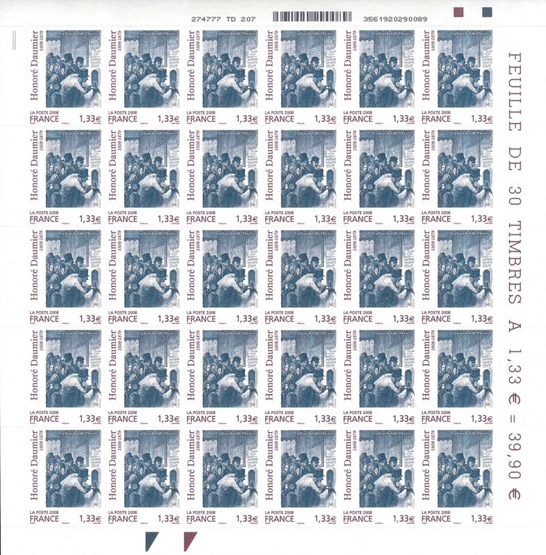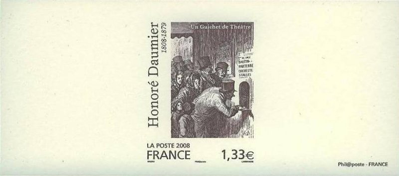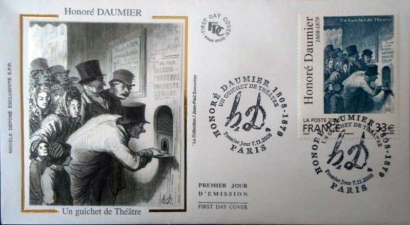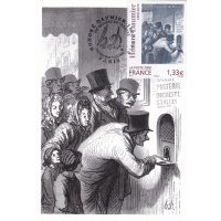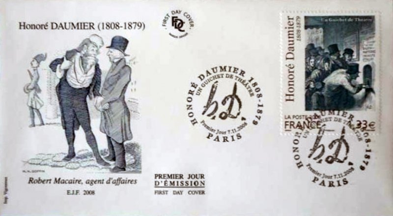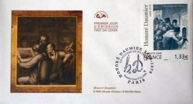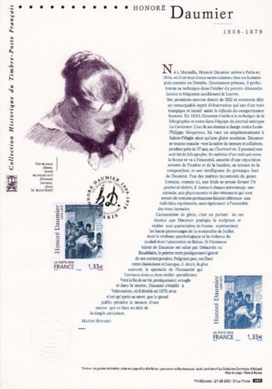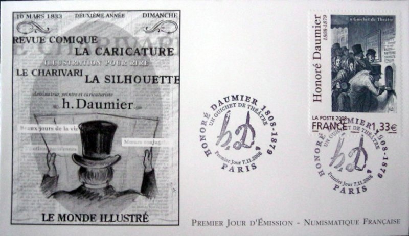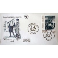| Commentaire | Existe également sur papier gommé. La manifestation premier jour a lieu du 7 au 9 novembre au Salon philatélique d'automne, à Paris, et le 8 novembre à Valmondois où Daumier est mort. Le cachet par Aurélie Baras reprend les initiales de l'artiste |
