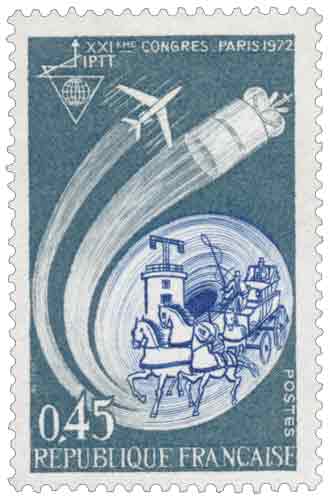 | Commentaire | Émis en France en 1972 à l’occasion du XXIᵉ Congrès mondial de l’Internationale du personnel des P.T.T., tenu à Paris, ce timbre commémoratif s’inscrit dans la tradition des émissions valorisant les grandes rencontres professionnelles et syndicales liées aux services publics des communications. D’une valeur faciale de 0,45 franc, il correspond à l’affranchissement du pli non urgent de 20 à 50 grammes pour le régime intérieur, ce qui lui confère un usage postal réel et identifié, en adéquation avec la vocation fonctionnelle des timbres de cette période. Le contexte de l’émission renvoie à l’histoire et au rayonnement international de l’Internationale du personnel des P.T.T., fondée à Paris en 1911 et devenue, au fil des décennies, une organisation mondiale regroupant plusieurs millions d’adhérents issus de nombreux pays sur tous les continents, autour d’idéaux de solidarité, de démocratie et de progrès des services postaux et de télécommunications. Le timbre met en perspective cette dimension historique et prospective par une composition graphique dynamique qui associe des symboles majeurs de l’évolution des communications : au centre, des images du passé chères aux philatélistes, telles que le télégraphe aérien de Claude Chappe et la malle-poste hippomobile, rappellent les fondements des réseaux de transmission et d’acheminement du courrier, tandis qu’en périphérie apparaissent les moyens modernes de communication intercontinentale, représentés par un avion et un satellite. Cette juxtaposition visuelle traduit l’idée de continuité technologique, depuis les premiers systèmes optiques et le transport terrestre jusqu’aux communications aériennes et spatiales qui, dans les années 1960 et 1970, transforment profondément les échanges mondiaux. Le choix de l’impression en taille-douce rotative, confiée à Georges Bétemps, apporte relief et précision au dessin, tout en soulignant le caractère officiel et solennel de l’émission. Le timbre s’insère ainsi dans la série plus large des émissions françaises consacrées aux P.T.T. et à la modernisation des communications, en reflétant à la fois l’histoire postale, les enjeux contemporains du secteur et la dimension internationale du mouvement syndical représenté. Une référence marquante, implicitement évoquée par l’iconographie satellitaire, est l’entrée en service opérationnelle des télécommunications par satellite au milieu des années 1960, événement qui a durablement modifié les pratiques et les perspectives du monde des communications. Article rédigé pour WikiTimbres |