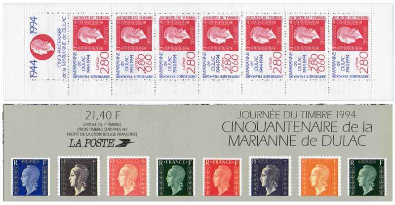 | Commentaire | Journée du timbre. Cinquantenaire de la Marianne de Dulac. Les timbres sont imprimés sur un papier neutre sous UV. |
