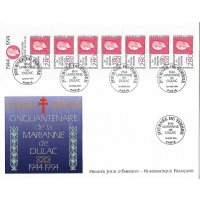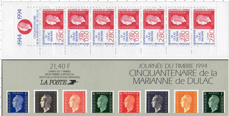 | Commentaire | Journée du timbre. Cinquantenaire de la Marianne de Dulac. Les timbres sont imprimés sur un papier neutre sous UV. |