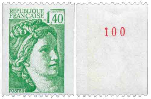 | Commentaire | Roulette de 1000 timbres avec numérotation en rouge au dos tous les 10 timbres. Le premier numéro est 000, le dernier est 010. La gomme au dos est brillante. Existe avec gomme mate ou tropicale, existe également non surchargé accidentellement de bandes phosphorescentes. |