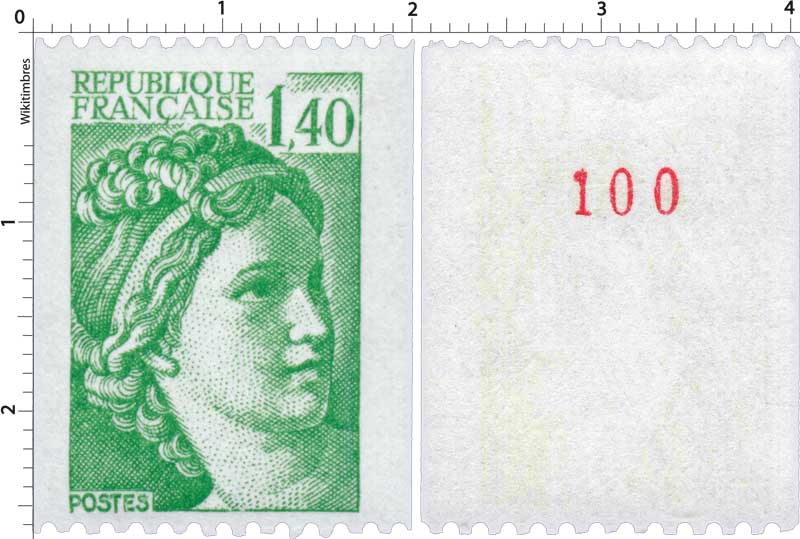 | Commentaire | Roulette de 1000 timbres avec numérotation en rouge au dos tous les 10 timbres. Le premier numéro est 000, le dernier est 010. La gomme au dos est brillante. Existe avec gomme mate ou tropicale, existe également non surchargé accidentellement de bandes phosphorescentes. |