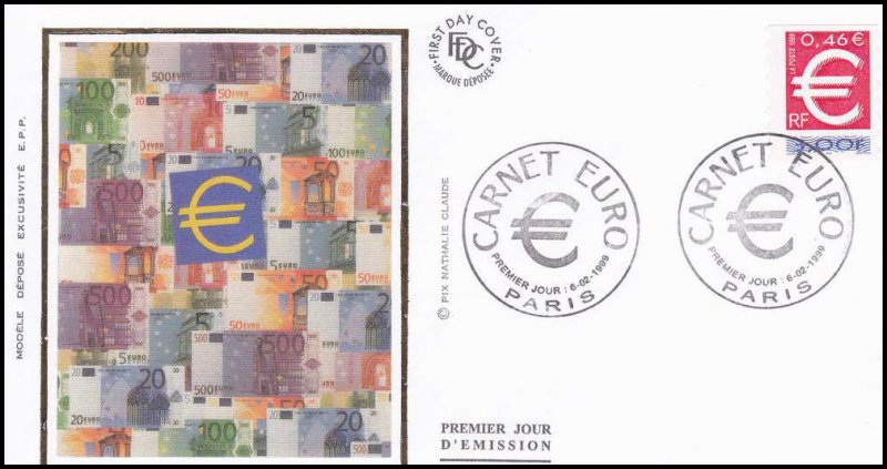 | Description | Le timbre Euro. Carnet. Adhésif. Pour la première fois la valeur est exprimée en franc français et en euro |