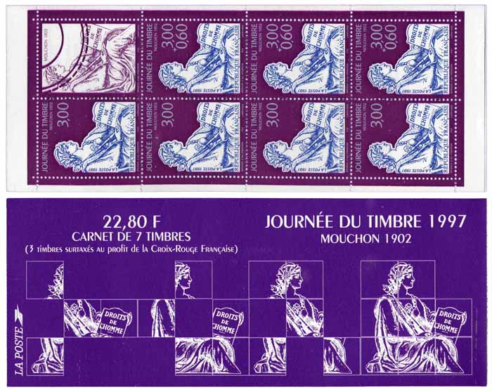| Commentaire | Couverture du carnet dessinée et mise en page par: Charles BRIDOUX Imprimée en : héliogravure. Les timbres-poste sont imprimés sur un papier avec azurants optiques visibles sous UV. |