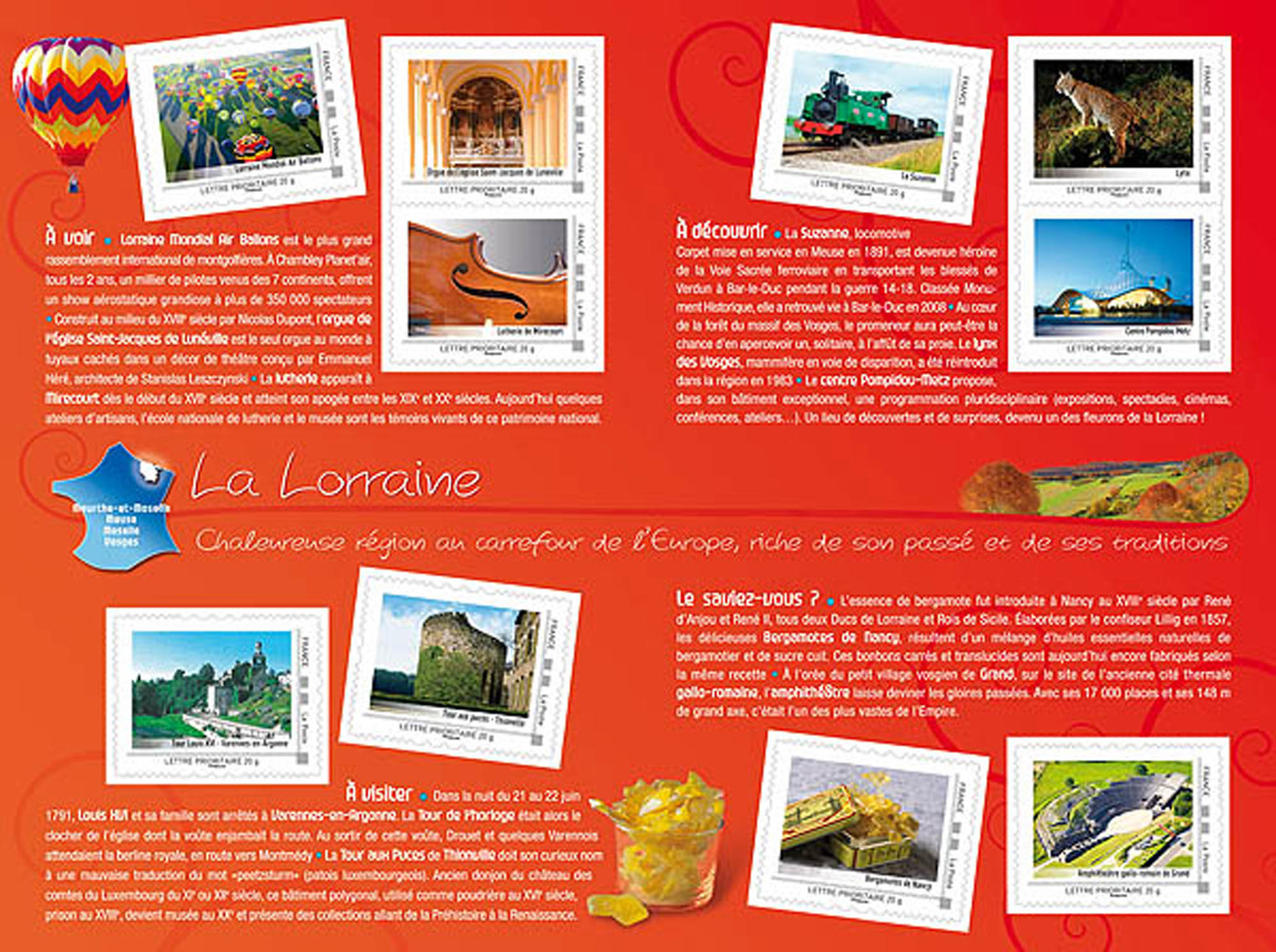 | Commentaire | Lorraine Mondial Air ballons, Orgue de l’église St Jacques de Lunéville, Lutherie de Mirecourt, Tour Louis XVI - Varennes-en-Argonne, Tour aux puces, Thionville, La Suzanne, Lynx, Centre Pompidou – Metz, Bergamotes de Nancy, Amphithéâtre gallo romain de Grand |