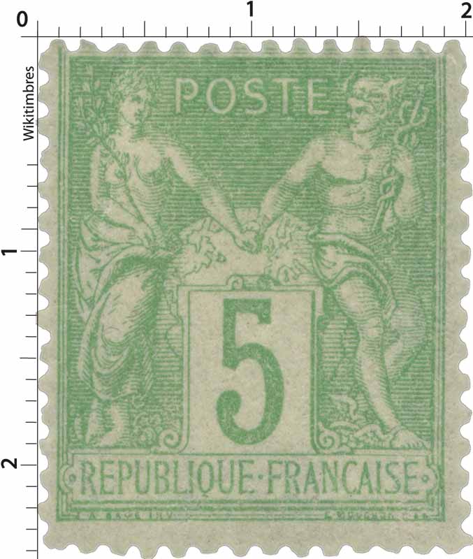 | Commentaire | Sage. Type III En savoir plus sur Wikipédia : Type sage ou allégorie de la Paix et le Commerce s’unissant Émis en décembre 1898, le timbre Sage de 5 centimes vert-jaune résulte des décisions du congrès de l’UPU de 1897, qui recommande une uniformisation des couleurs internationales : bleu pour la lettre (25 c), rouge pour la carte postale (10 c) et vert pour les imprimés (5 c). La série Sage est alors ajustée, mais seule la nouvelle valeur 5 c vert-jaune est finalement mise en circulation, sa teinte s’éloignant suffisamment du bleu pour éviter toute confusion. Cette valeur appartient aux dernières émissions du type Sage, peu avant l’arrivée des types Blanc, Mouchon et Merson en 1900. La nuance vert-jaune montre des tirages plus ou moins soutenus, caractéristiques de cette période tardive. En oblitéré, les cachets à date ordinaires sont courants, mais les plis d’imprimés correctement affranchis à 5 centimes restent les pièces les plus représentatives de l’usage postal réel. Aucun faux d’époque notable n’est recensé pour cette émission, et la valeur ne fait pas partie des réimpressions Granet. Ce 5 c vert-jaune constitue le dernier ajustement tarifaire international de la série Sage avant son remplacement définitif. |