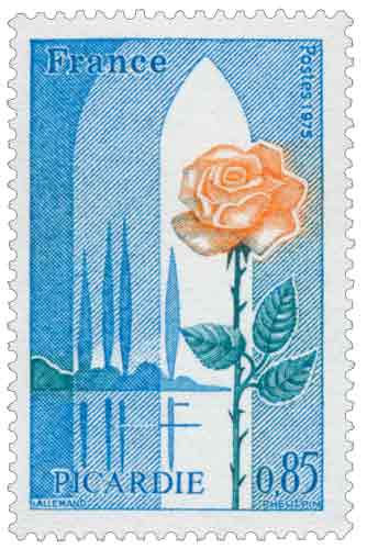 | Commentaire | Émis en 1975, le timbre consacré à la Picardie s’inscrit dans la série des régions administratives françaises et accompagne la reconnaissance institutionnelle, depuis 1972, de cette entité regroupant l’Aisne, l’Oise et la Somme. Cette émission coïncide avec l’« Année de l’art gothique en Picardie », soulignant le rôle majeur de ce territoire dans la genèse et le développement de l’architecture gothique en France. La composition du timbre, structurée autour d’un arc brisé, renvoie directement à cet héritage médiéval, omniprésent dans des ensembles emblématiques tels que Senlis, Soissons, Beauvais ou Amiens, où s’expriment successivement les formes primitives, rayonnantes et flamboyantes de l’art ogival. La rose stylisée évoque quant à elle la richesse culturelle plus large de la région, qui a vu naître ou s’épanouir des figures majeures de la musique, des arts plastiques, de la littérature et du théâtre, tout en devenant un symbole identitaire fort. Le paysage suggéré, entre peupliers, cours d’eau et ciels changeants, rappelle l’importance de l’hydrographie picarde et son influence sur l’agriculture, les élevages et les activités agro-industrielles traditionnelles. Cette représentation s’inscrit également dans une lecture plus contemporaine de la région, marquée par la modernisation de ses infrastructures, son rôle de carrefour entre le nord de l’Europe, Paris et l’Angleterre, et le développement de secteurs industriels et tertiaires diversifiés. Par ce timbre, la politique postale française propose une synthèse symbolique de l’histoire, de la culture et du dynamisme économique de la Picardie, en faisant de la rose régionale l’emblème d’un territoire d’échanges et de continuités, inscrit au cœur de l’Europe moderne. Article rédigé pour WikiTimbres |