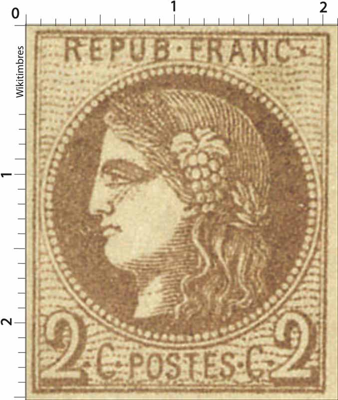 | Commentaire | Retrait 1872 Le 2 centimes brun-rouge, n°40B, appartient à l’Émission de Bordeaux, réalisée entre 1870 et 1871 en pleine désorganisation du service postal après la capitulation de Napoléon III et l’encerclement de Paris. Privés des ateliers parisiens, les services postaux du territoire non envahi doivent être réapprovisionnés en urgence. Le gouvernement de la Défense nationale, installé à Bordeaux, décide alors de produire des timbres provisoires au type Cérès, en rupture avec les émissions impériales devenues obsolètes. La Monnaie de Bordeaux, ne maîtrisant pas la typographie utilisée à Paris, se tourne vers la lithographie, technique qui impose la fabrication de plusieurs pierres d’impression en raison de leur usure rapide. Le 2c brun-rouge est émis le 18 décembre 1870 et existe en deux reports différents, le report 1, rare, et le report 2, auquel correspond ce n°40B. Chaque report présente des caractéristiques propres résultant des transferts successifs du dessin et des contraintes matérielles de cette production improvisée. Avec ses reports distincts, ses nuances variables et son contexte d’émission exceptionnel, le 2c brun-rouge de Bordeaux constitue une valeur recherchée tant pour son histoire que pour l’étude des états de pierre typiques de cette période.