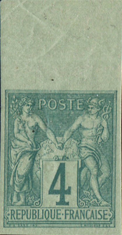 | Commentaire | Sage. Type I (N sous B). Retrait fin 1877 En savoir plus sur Wikipédia : Type sage ou allégorie de la Paix et le Commerce s’unissant Le 4 centimes vert, n°63, appartient au type I de la première émission Sage et fait partie des treize valeurs définies par le décret du 5 juillet 1875, qui réorganise entièrement la gamme des timbres courants. Bien que imprimé dès mars 1876, il n’est mis en vente qu’à la fin du mois de novembre, l’administration souhaitant d’abord écouler les importants stocks du 4c Cérès encore disponibles. Cette valeur, associée aux affranchissements réduits ou combinés, s’intègre dans la nouvelle logique tarifaire instaurée sous la IIIe République. Sa nuance vert soutenu offre une distinction claire par rapport aux autres faibles valeurs de la série, conformément aux prescriptions du décret de 1875 destinées à éviter toute confusion dans l’usage postal. Comme pour l’ensemble du type Sage, le dessin retenu — une allégorie du Commerce et de la Paix unis — provient du concours national lancé en août 1875. Le type I se reconnaît à la position de la signature « J A SAGE INV », où le N apparaît sous le B de « RÉPUBLIQUE ». Le n°63 illustre ainsi la transition progressive entre les dernières émissions Cérès et l’installation durable du type Sage comme série de référence. |