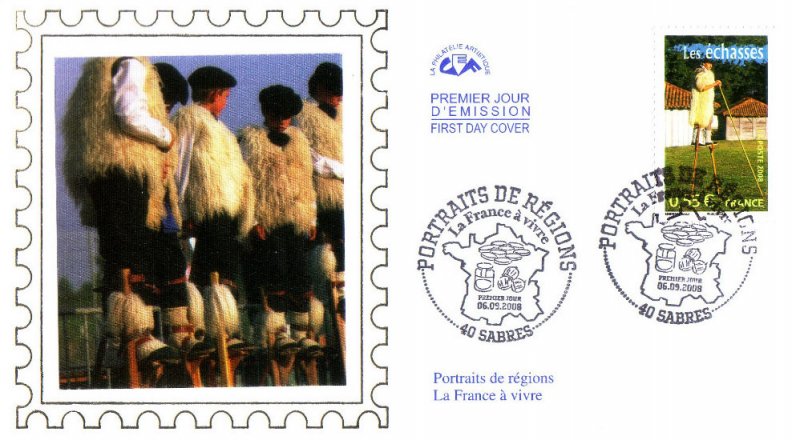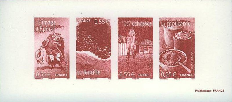 | Commentaire | 4 verticaux 26 x 40 mm 6 horizontaux 40 x 26 mm. La manifestation premier jour se déroule les 6 et 7 septembre dans plusieurs villes liées aux éléments représentés par l'émission : Aix-en-Provence, Céret, Cilaos, Dijon, Dole, Épinal, Laruns, Le Puy-en-Velay, Paris, Sabres et Thônes. Valérie Besser dessine le cachet premier jour : une carte de France dans laquelle se trouvent trois châtaignes, un pot de moutarde et des calissons. |