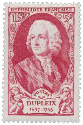 | Commentaire | Émis en 1949, le timbre-poste gommé consacré à Joseph-François Dupleix appartient à la série française des Célébrités du XVIIIᵉ siècle, ensemble commémoratif visant à rappeler, par une diffusion postale effective, le rôle de grandes figures historiques françaises dans les domaines politique, scientifique et culturel. Dessiné et gravé par Raoul Serres, ce timbre vertical présente un portrait officiel de Dupleix, gouverneur général des établissements français de l’Inde, figure emblématique de la rivalité coloniale franco-britannique au milieu du XVIIIᵉ siècle. Imprimé en taille-douce rotative, procédé caractéristique des émissions commémoratives de qualité de l’après-guerre, il offre une gravure précise et un modelé adapté à la représentation d’un personnage historique. Sa place dans la série est celle d’une valeur à caractère historique assortie d’une surtaxe au profit de la Croix-Rouge française, tandis que son usage postal correspond à l’affranchissement de la lettre simple pour l’intérieur, assurant une circulation réelle sur le courrier de 1949. Le choix de Dupleix renvoie directement à la période des établissements français en Inde, dont il fut l’un des principaux artisans avant sa destitution en 1754, épisode consensuel illustrant les ambitions et les limites de la politique coloniale française au XVIIIᵉ siècle.