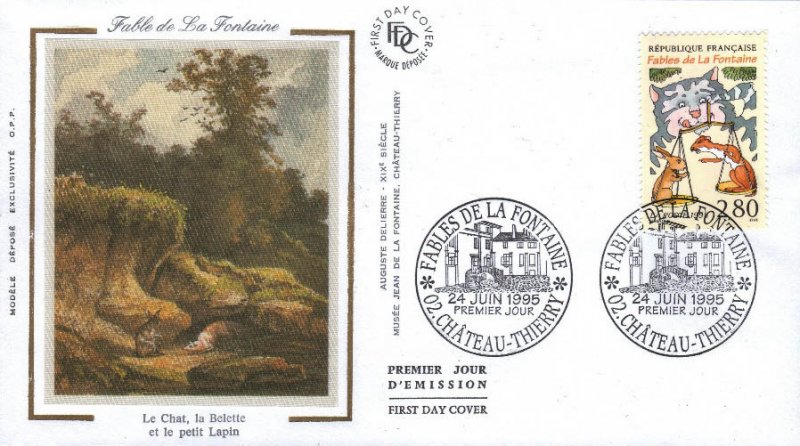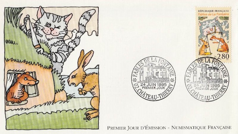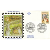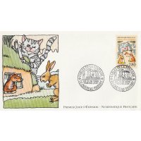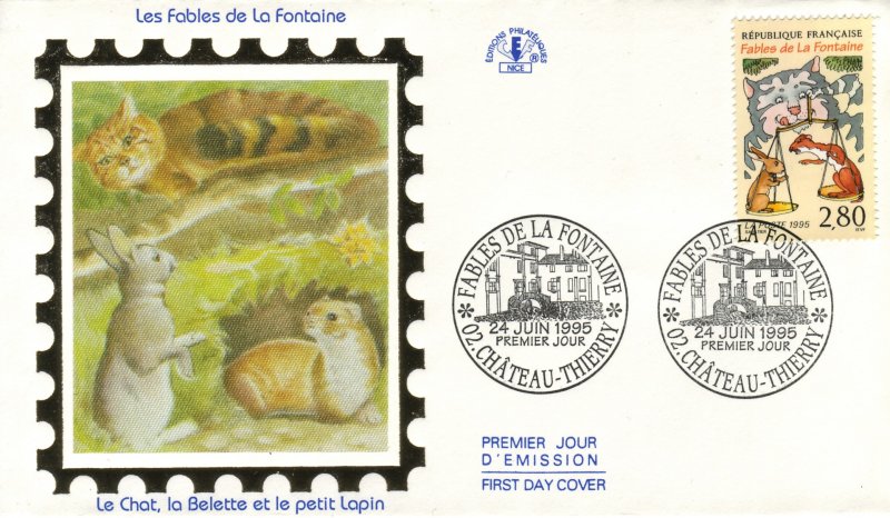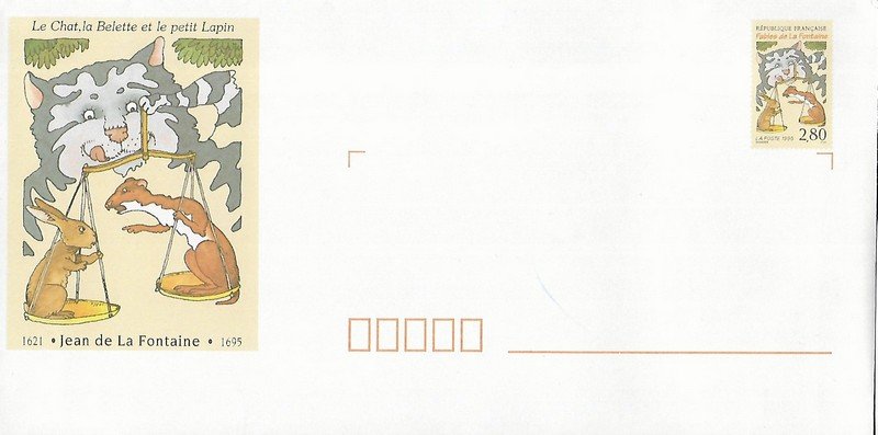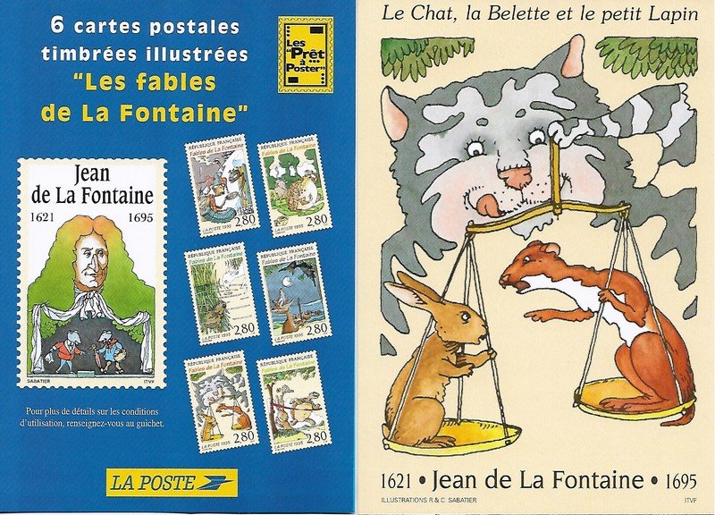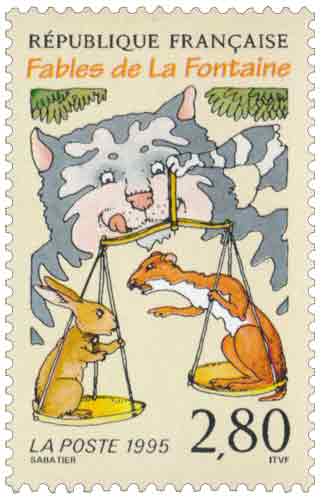 | Description | Le chat, la belette et le petit lapin. Tricentenaire de la mort de Jean de la Fontaine (1621-1695), poète, fabuliste et romancier, né à Château-Thierry (Aisne) |