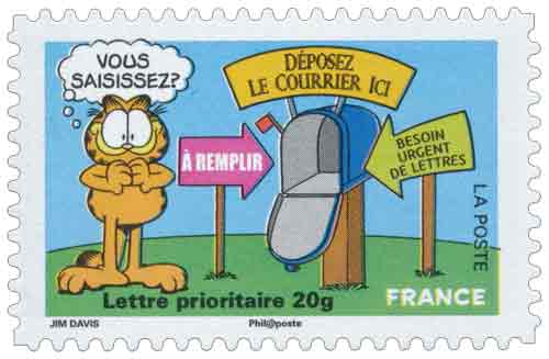 | Commentaire | La mise en vente anticipée a lieu le 18 septembre à Saint-Brice-Courcelles avec un cachet illustré du chat Garfield de face et souriant, sans mention « premier jour ». Timbre sans millésime |