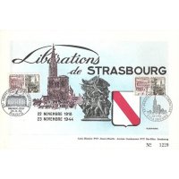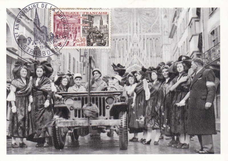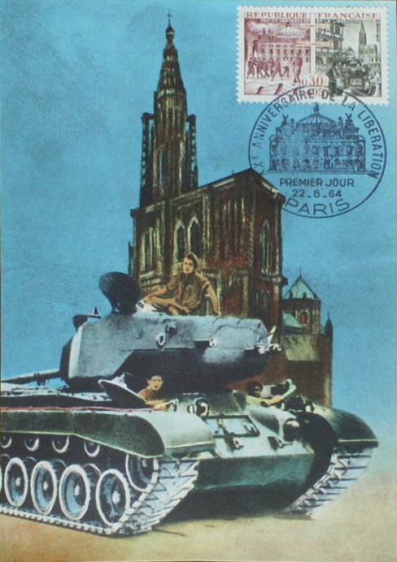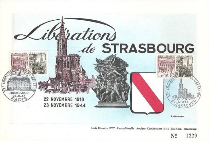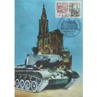 Le 23 Novembre 1944, les blindés attaquent Strasbourg.(côté droit du timbre avec la Cathédrale de Strasbourg au fond). La garnison allemande se rend le surlendemain.