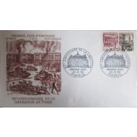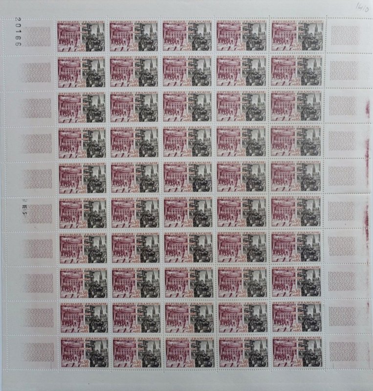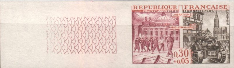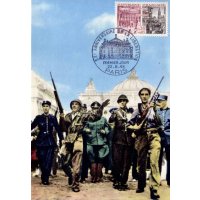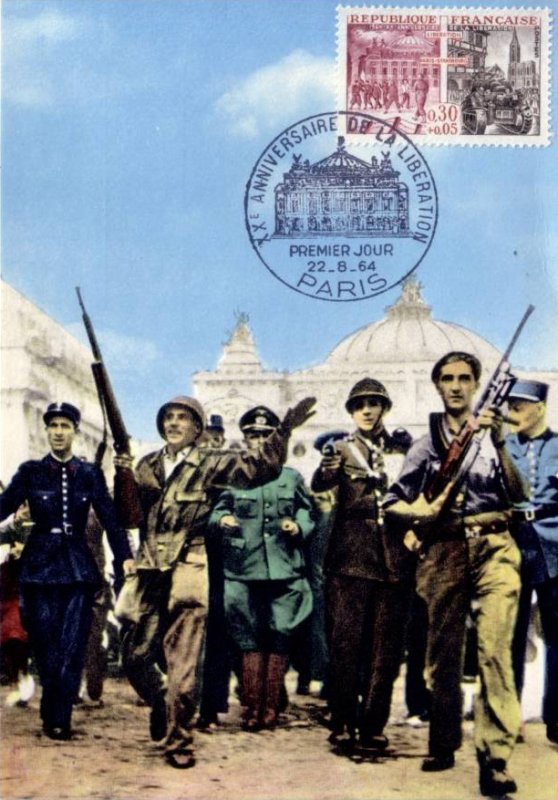 Pendant que l'épuration commence à Paris (on voit ici des miliciens qui se rendent aux Alliés, place de l'Opéra (côté gauche du timbre), le Général Leclerc continue sa progression vers l'est, pour assurer la jonction avec l'armée du Maréchal de Lattre de Tassigny remontant depuis la Provence.
