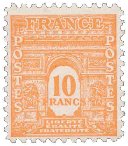 | Commentaire | Voir la vidéo "Histoires de timbres" Ce timbre gommé de France de 1944 appartient à la deuxième série du Gouvernement provisoire dite « Arc de Triomphe », imprimée aux États-Unis en offset afin d’assurer rapidement la reprise des services postaux dans les zones libérées à partir de l’été 1944 ; la valeur de 10 francs, de couleur orange, correspondait principalement à un usage d’affranchissement complémentaire, ce qui explique une utilisation postale limitée et une présence fréquente à l’état neuf dans les collections ; l’iconographie reprend une vue photographique de l’Arc de Triomphe fournie par une institution américaine, traduite graphiquement dans un style volontairement neutre et fonctionnel, typique de l’impression offset, technique choisie pour sa rapidité d’exécution et sa capacité de production industrielle dans un contexte de guerre et de transition politique. |