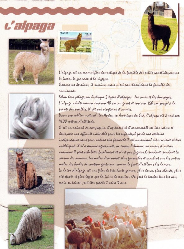 | Commentaire | L’alpaga, un mammifère ruminant proche du lama, vit à environ 4500 mètres d'altitude en Amérique du Sud. Sa laine très réputée est plus légère que celle du mouton. |