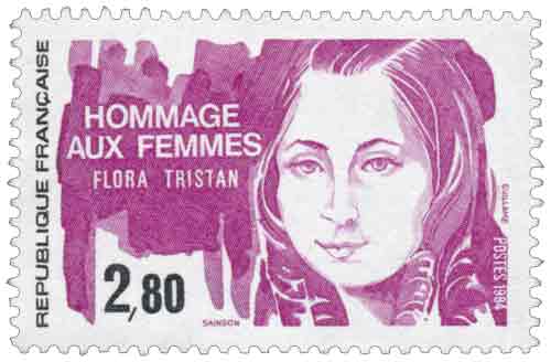 | Commentaire | Ce timbre rend hommage à Flora Tristan dans le cadre de la série française consacrée aux femmes remarquables, émise en 1984 à une période où la reconnaissance du rôle historique des figures féminines s’affirme davantage dans la politique commémorative postale. Née à Paris en 1803 et morte à Bordeaux en 1844, Flora Tristan incarne une pensée sociale et féministe précoce, développée bien avant l’essor des mouvements ouvriers organisés de la seconde moitié du XIXe siècle. Issue d’une double origine française et péruvienne, son parcours personnel, marqué par un mariage conflictuel, la rupture avec la vie conjugale et une grande précarité matérielle, nourrit une réflexion profonde sur la condition des femmes et des classes laborieuses. Ses voyages, notamment en Angleterre et en Amérique du Sud, jouent un rôle décisif dans la formation de ses idées, en l’exposant directement aux réalités du paupérisme, de l’exploitation industrielle et des inégalités juridiques. Ce timbre évoque ainsi une figure qui relie intimement la revendication féminine à la question sociale, notamment à travers son ouvrage L’Union ouvrière, dans lequel elle appelle à l’union des travailleurs comme fondement de l’émancipation collective. Son engagement se prolonge jusqu’à l’épuisement, lors d’une tournée militante entreprise en 1844 pour défendre ses idées, notamment en faveur du rétablissement du divorce. Par cette émission, la philatélie française souligne la dimension pionnière de son combat et inscrit Flora Tristan dans une mémoire nationale élargie, où l’histoire sociale et politique se transmet aussi par le support postal, rappelant la contribution essentielle de certaines femmes aux grands courants de pensée du XIXe siècle. Article rédigé pour WikiTimbres |